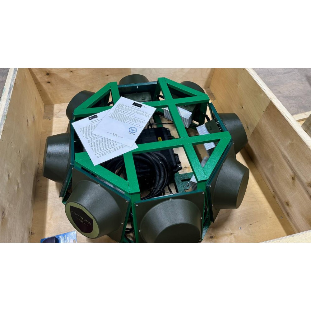 Это средство радиоэлектронной борьбы (РЭБ) эффективно защищает военную технику от FPV дронов. Конструкция включает восемь модулей радиопомех, которые создают помехи на 360 градусов по горизонтали и 90 градусов по вертикали. Модули закреплены на стальной раме с крепежными точками, что позволяет устанавливать устройство на технику.