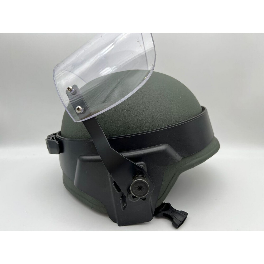 Защитный шлем изготовлен из композитного материала на основе 19 слоев арамида и СВМПЭ со специальной пропиткой фенольными смолами. Забрало защищает от попадания пистолетных пуль и осколков. Соответствует классу защиты NIJ IIIA. Толщина защитного экрана – 8 мм.